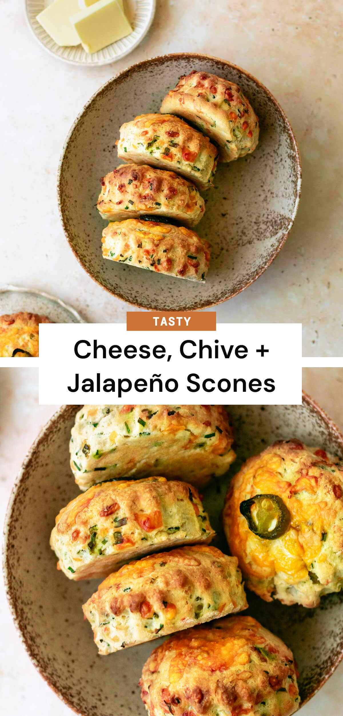 These cheese, chive, and jalapeño scones are sure to satisfy your savoury cravings. They’re deliciously buttery and flaky, and laced with sharp cheddar, garlicky chives, and fiery jalapeños.