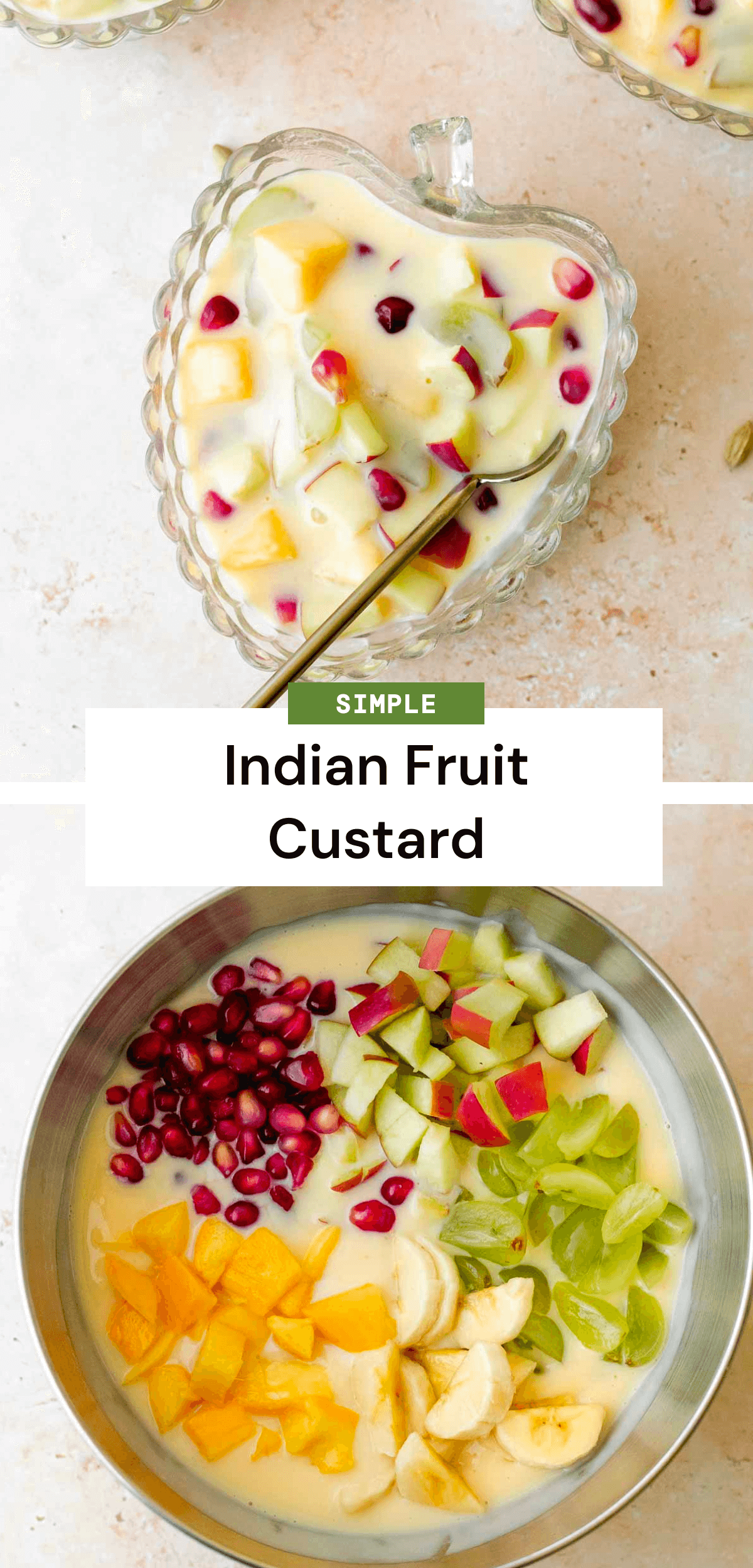 Indian fruit custard is a fusion between English custard, Indian spice, and nature’s candies – fruits! It combines a creamy, vanilla and cardamom-flavoured custard base with a variety of chopped fruits like bananas, mangoes, apples, grapes, and pomegranates.