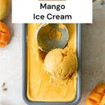 - Pour the mango mixture into a loaf tin (I use a standard 2lb one) or freezer-safe container and cover it with foil or plastic wrap. Freeze the ice cream for 3-4 hours until it has set.