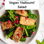 I love serving this vegan halloumi alongside my favourite vegetables in a vibrant salad. This salad features spinach, sugar snap peas, purple sprouting broccoli and pomegranate, but feel free to use whatever veggies you prefer or have on hand!